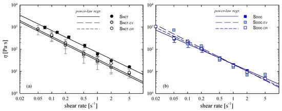 In Figure 4, the flow curves of the different samples are shown. Data are interpolated with a power law function, Equation (1):