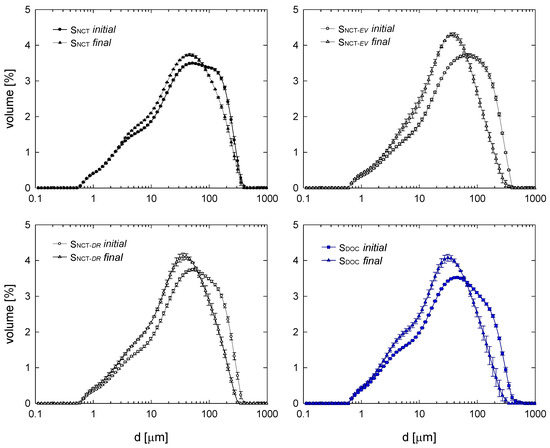 Initial particle size distribution of the four samples: Snct, Snct-ev, Snct-dr, Sdoc. Error bars are the standard deviations of at least three replicates.