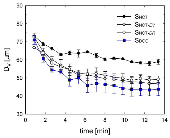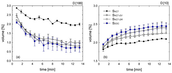 To highlight the breakup of macroaggregates in favour of the formation of smaller aggregates, in Figure 8 we plot the evolution over time of the volume fraction of particles with a large diameter, D [186 μm] Figure 8a, and particles with a small diameter, D [10 μm] Figure 8b. As expected, the former decreases over time, while the latter increases. It is also evident that: (i) the evolution of both volume fractions of the Snct sample is much less pronounced than that of the other three samples; (ii) the curves of Snct-ev and Snct-dr lie in between the curves of Snct and Sdoc samples, and in any case, are closer to the Sdoc curves.