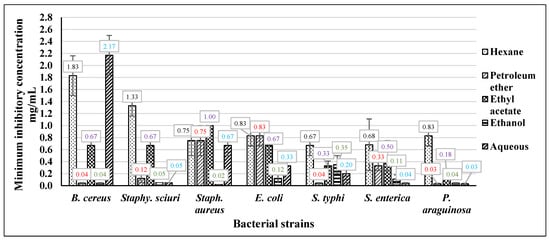 As illustrated in Figure 2, the hexane extract of Neem exhibited effects within the range of 0.67 to 1.83 mg/mL, and no notable distinction was observed among various concentrations concerning all food-borne pathogenic bacteria. The extract from petroleum ether exhibited the most substantial efficacy against E. coli, with a minimum inhibitory concentration (MIC) of 0.83 mg/mL. Staphylococcus aureus was inhibited at a MIC of 0.75 mg/mL, while the most potent activity with the lowest MIC value of 0.04 mg/mL was observed against Bacillus cereus. The ethyl acetate extract exhibited the most significant activity against Pseudomonas aeruginosa, with a minimum inhibitory concentration (MIC) value of 0.18 mg/mL. The second highest activity was observed against Salmonella typhi, with a MIC value of 0.33 mg/mL.