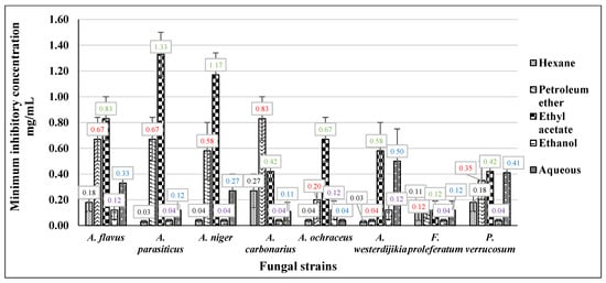 As depicted in Figure 3, the Neem hexane extract exhibited considerable efficacy, with its impact spanning from 0.03 mg/mL to 0.27 mg/mL, and no discernible variation was observed across different concentrations against all mycotoxigenic fungi. The results obtained from the petroleum ether extract indicated that the maximum MIC value was recorded at 0.83 mg/mL against A. carbonarius. However, the most potent activity with the lowest MIC value was observed at 0.04 mg/mL against A. westerdijikia. The ethyl acetate extract exhibited the greatest activity level against F. proliferatum, as indicated by a minimum inhibitory concentration (MIC) value of 0.12 mg/mL. A. carbonarius and P. verrucosum also displayed notable activity, with a MIC value of 0.42 mg/mL. Conversely, the least activity was observed against A. parasiticus, with a MIC value of 1.33 mg/mL. The ethanolic extract exhibited notable efficacy against various mycotoxigenic fungi, with effects ranging from 0.04 mg/mL to 0.12 mg/mL. Notably, no significant differences were observed between the diverse concentrations tested.