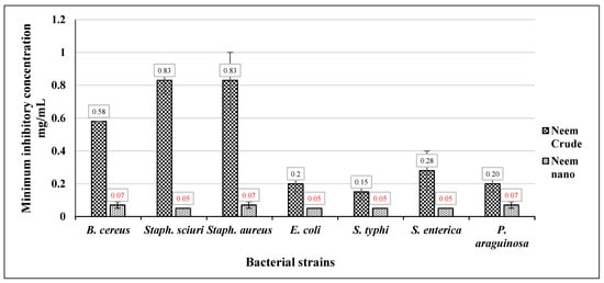 The MIC of Neem crude aqueous extract and Neem Ag-NPs against foodborne pathogenic bacteria.