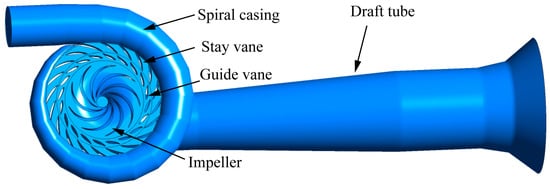 The numerical model studied in this paper is presented in Figure 1. The numerical simulation of computational domain consists of five parts: the draft tube, impeller, guide vanes, stay vanes, and spiral casing.