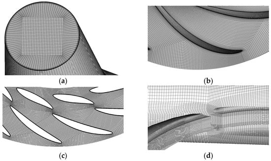 Local detailed grids of each component of the pump turbine. (a) Draft tube. (b) Impeller. (c) Diffuser (guide/stay vanes). (d) Spiral casing.