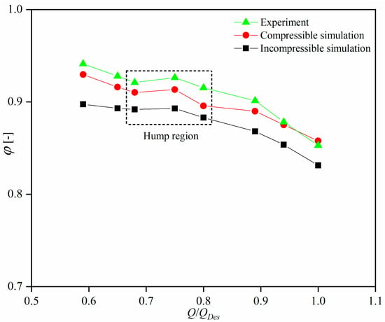 Figure 3 presents the comparison of the head coefficient between the compressible and incompressible numerical calculations and the experimental results, and the corresponding relative errors are also summarized in Table 3. The results depicted in Figure 3 show that the hump region occurs between 0.68QDes and 0.80QDes, where the head coefficient does not continue to increase as the flow decreases. Both incompressible and compressible models demonstrate favorable agreement with the performance curve, but compared with incompressible one, the head coefficient of compressible calculation results is found to be more similar to the experimental value, with a smaller error of less than 2.5%. Therefore, the compressible numerical simulation was deemed to be reliable for further study.