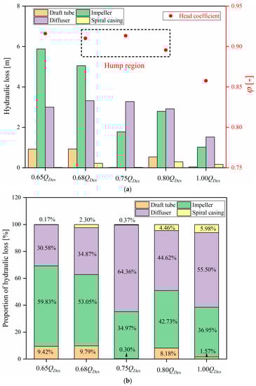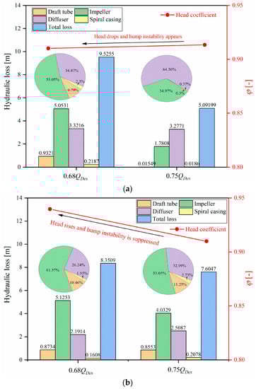 Drawing upon the analysis conducted in Section 3.1 and Section 3.2, it is inferred that the onset of the hump region is primarily attributed to the hydraulic loss of the diffuser, and the application of water injection can postpone the occurrence of this phenomenon. Therefore, it can be hypothesized that the delay of the emergence of the hump region is linked to the reduction of hydraulic losses in the diffuser after water injection, as substantiated in the subsequent analysis. A comparison of hydraulic losses in different parts in the hump region without and with water injection is shown in Figure 8.