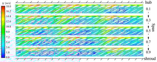 Given that water injection leads to a reduction in hydraulic loss in the diffuser, it is imperative to acquire a comprehensive understanding of the flow characteristics within it. In this study, a particular emphasis is placed on the flow field in the guide vanes near the shroud where water is injected. The velocity streamline distribution at different times near the shroud (90% Span) without and without water injection is plotted in Figure 9.