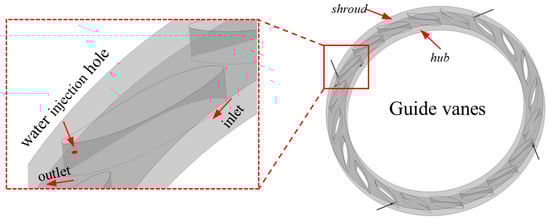 Figure 5 depicts the streamline distribution in the diffuser with different spanwise directions at 0.80QDes. It was found that the unsteady flow phenomenon is mainly concentrated near the out of the shroud of the guide vanes. The animation streamlines at various times indicate the presence of four stall cells in the diffuser. Therefore, in this paper, four symmetrically distributed 2 mm holes were arranged in the flow separation area of the shroud, and water with a certain flow rate was injected to block the development of the stall cells, as shown in Figure 6.