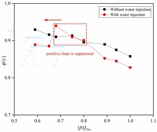Consequently, it can be concluded that water injection is capable of mitigating flow loss in diffusers. It is precisely this change that prevents the head from falling at the hump valley point (i.e., 0.68QDes), thus delaying the formation of the hump region and expanding the stable range of unit operation.