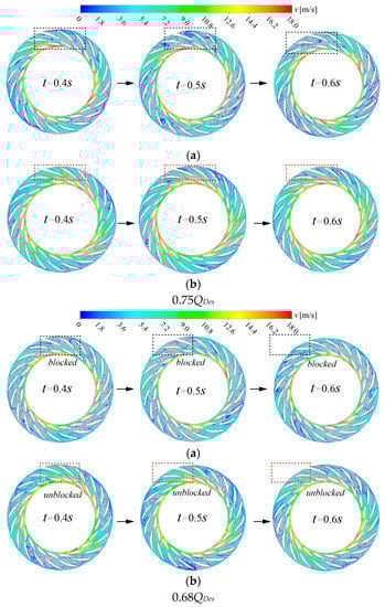 Streamline comparison in the diffuser near the shroud at different times at 0.75QDes and 0.68QDes. (a) Without water injection. (b) With water injection.