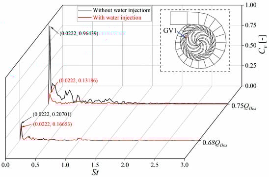 Figure 10 portrays the results of the velocity spectrum in guide vanes of the monitoring points, GV1. In the case without water injection at 0.75QDes, a dominant frequency peak at St0.0222 can be observed. Apparently, the high-amplitude low-frequency pulsation intensity obtained at GV1 is significantly suppressed due to water injection, with an amplitude reduction of about 86%. At the operating point 0.68QDes, the dominant peak is still St0.0222; although, the water injection effect on the velocity fluctuations at GV1 is slightly less pronounced than it is in the case of 0.75QDes, but the amplitude is still reduced by about 20%.