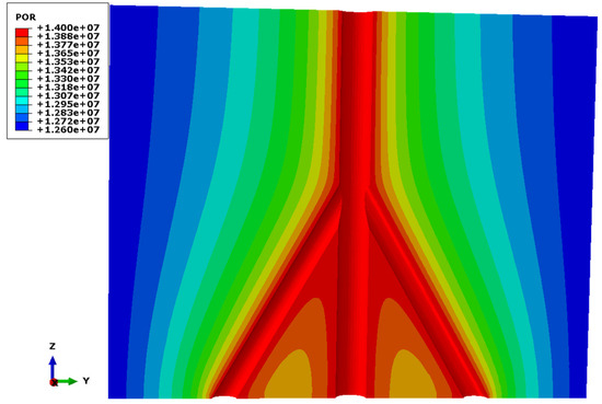 Figure 7 illustrates the nephogram for equivalent plastic strain under different wellbore diameters of multilateral wells. It can be seen from the figure that the regions with equivalent plastic strain are all concentrated at the multilateral junctions. Stress is concentrated at the junctions between the main wellbore and branches. As the wellbore diameter of branches enlarge, the value and the range of regions with the equivalent plastic strain both reduce. The wellbore diameter of multilateral wells exerts slight influences on the wellbore stability.