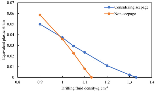 The two curves under seepage and non-seepage conditions intersect at a point where the drilling fluid density is about 1 g/cm3. When the drilling fluid density is lower than the value at the intersection, the maximum equivalent plastic strain under the non-seepage condition is larger than that under the seepage condition. If the drilling fluid density exceeds the value at the intersection, the maximum equivalent plastic strain under the non-seepage condition is lower than that under the seepage condition. Because the formation pressure is 12.6 MPa, the two curves under seepage and non-seepage conditions are intersected when the fluid column pressure of drilling fluids is 12.6 MPa. In the FEA model, the boundary conditions of pore pressure under the two conditions are the same and the fluid column pressure of drilling fluids in wellbores is identical to the formation pressure, so the calculated maximum equivalent plastic strain is also same.