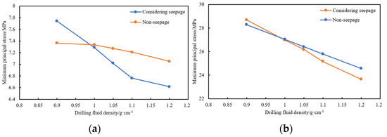 Figure 6 illustrates the change trends of the minimum and maximum principal stresses under different drilling fluid densities. It can be seen that the minimum and maximum principal stresses intersect at the drilling fluid density of 1.0 g/cm3 under seepage and non-seepage conditions. In the drilling process, the maximum and minimum principal stresses under the seepage condition are lower than those under the non-seepage condition. So, the Mohr stress circle shifts leftwards to approach the failure envelope in the process and the wellbores are more prone to failure.