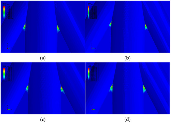 The nephograms for distribution of the equivalent plastic strain under different angles between main wellbore and branches are illustrated in Figure 10. It can be seen that, when the angles are 15° and 30°, the equivalent plastic strain in the wellbores is mainly concentrated at multilateral junctions. It has a large value, and the wellbores in the region with equivalent plastic strain are more prone to failure. When the angle exceeds 45°, the equivalent plastic strain in the wellbores begins to transfer from the multilateral junction to the inner of multilateral wellbores. This is because wellbore structure is special at the multilateral junctions when the angle is small. At the location, stress concentration is likely to occur while the stress difference in multilateral wellbores is so small that no stress concentration appears. When the angle is large, the stress difference in the multilateral borewells begins to enlarge and stress concentration starts to appear in the multilateral wellbores. At the same time, stress concentration at the multilateral junctions gradually weakens and disappears, and the regions with equivalent plastic begin to transfer from the multilateral junctions to the surrounding areas of multilateral wellbores.