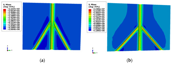 Nephogram for Mises stress distribution, Pa. (a)The relative azimuth is 0°, (b) The relative azimuth is 90°.