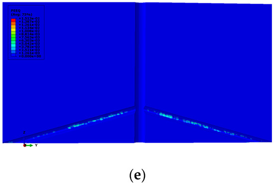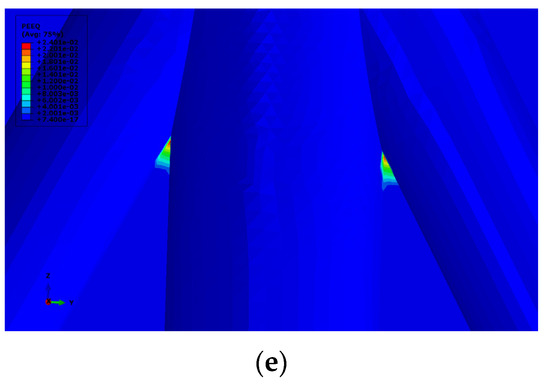 Nephograms for distribution of the equivalent plastic strain under different angles between main wellbore and branches. (a) 15°, (b) 30°, (c) 45°, (d) 60°, (e) 75°.