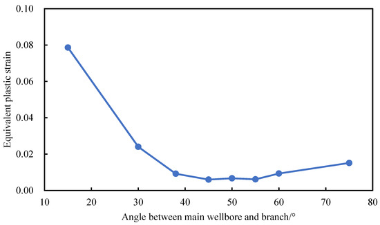 Figure 11 displays the change trend of equivalent plastic strain under different angles between the main wellbore and branches. As the angle enlarges, the maximum equivalent plastic strain decreases quickly at first, and then more slowly when the angle is smaller than 45°. The equivalent plastic strain rises slowly with the angle when the angle exceeds 45°; in the process, the regions of wellbore instability transfer from the multilateral well junction to the inner areas of multilateral wellbores. This is because, with the enlargement of the angle between main wellbore and branches, the equivalent plastic strain only appears in the multilateral wellbores. This can be approximately regarded as changes in wellbore stability of common directional wells: the larger the wellbore angle is, the greater the stress difference in wellbores, and therefore, the larger the equivalent plastic strain.