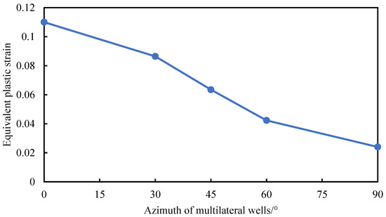 Change trend of the maximum equivalent plastic strain under different azimuths of multilateral wells.