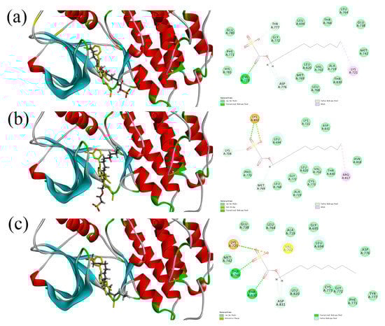 Alignment of the docked SNH with 4-annilinoquinazoline in the crystallographic complex. SNH and 4-annilinoquinazoline in the crystallographic complex are brown and yellow, respectively. The receptor–ligand interaction of SNH with the EGFR-TK active site: (a) conformation 1; (b) conformation 2; (c) conformation 3.