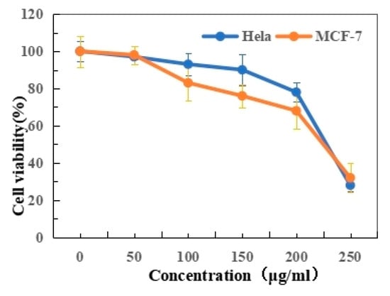 The cytotoxic influence of SNH on the proliferation of human breast cancer MCF-7 cells and human cervical carcinoma Hela cells is analyzed using an MTT experiment. As seen in Figure 3, SNH significantly suppressed the proliferative capacity of MCF-7 and Hela cells and appeared to be a dose dependent. Moreover, MFC-7 cells seemed to be more sensitive to SNH than Hela cells, and the inhibition rate was up to 70% in the 250 μg/mL SNH treated group. These results threw light on the fact that SNH has an obvious cytotoxic effect on both cell lines and has a broad spectrum of anticancer properties.