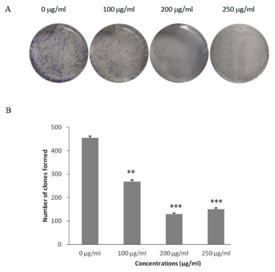 SNH significantly decreased the number of cell clones. MCF-7 cells were seeded in six-well plates, and each group was plated in three duplicate wells. The cells were exposed to different density of SNH (0, 100, 200, and 250 μg/mL), respectively, at 37 °C for 48 h. Then, the culture medium containing SNH was changed and cells continued to be cultured for 10 d. The colonies were treated with 4% paraformaldehyde for 30 min and then stained using 0.5% crystal violet solution for 20 min. (A) The colonies were observed by light microscopy. (B) The amount of cell clones was analyzed by Image J. ** p < 0.01; *** p < 0.001 versus the control group.