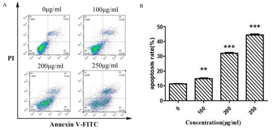To determine the influence of SNH on the apoptosis of MCF-7 cells, cells managed with different densities of SNH for 48 h were doubly stained using Annexin V antibody and propidium iodide (PI). Then, the quantity of apoptotic cells was checked by flow cytometry. As displayed in Figure 5A, compared with the control group, the number of apoptotic cells (including early and late apoptotic cells) was obviously promoted. In Figure 5B, cell apoptosis rates were 14.3%, 31.1%, and 44.1% in the SNH-treated groups (containing 100 μg/mL, 200 μg/mL, and 250 μg/mL), respectively. These results indicated that SNH increased the apoptotic rate of MCF-7 cells in a certain dose-dependent pattern, suggesting that SNH might play a role in the cytotoxicity on MCF-7 cells attributed to cell apoptosis.