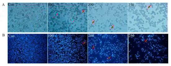 SNH induced the apoptosis of MCF-7 cells. MCF-7 cells were dealt with SNH (0, 100, 200, and 250 μg/mL) for 48 h. (A) Morphology of MCF-7 cells examined under a phase contrast microscope (200× magnification). (B) The nuclear morphology of MCF-7 cells analyzed via Hoechst33258 staining (100× magnification). The red arrow points to apoptotic cells.
