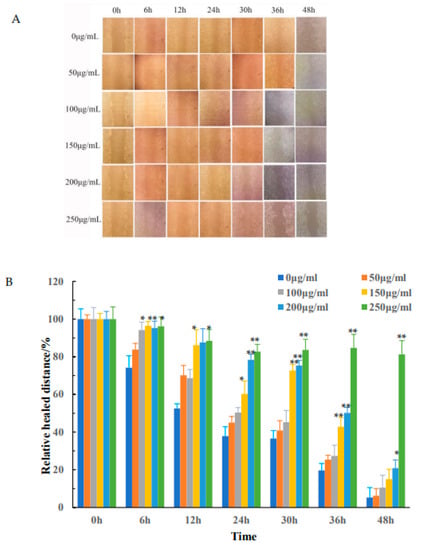 SNH inhibit MCF-7 cells’ migration. Images (100×) exhibited that MCF-7 cells migrated into wounded area in an in vitro scratch wound healing test. After MCF-7 cells were exposed to various density of SNH (0, 50, 100,150, 200, nd 250 μg/mL) for 48 h, images were photographed at 6 h, 12 h, 24 h, 30 h, 36 h, and 48 h. (A) shows cells photographed under a microscope, and (B) is the statistical graph of the crawling distances of MCF-7 cells. This assay was performed in triplicate. * p < 0.05; ** p < 0.01 versus the control group.