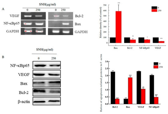 As previous studies show, the Bcl-2 family, including Bcl-2 and Bax, is considered to be an important participant in cell apoptosis via the mitochondrial pathway. NF-kB plays a major part in the proliferation and migration of cancer cells by regulating the expression of transcription factors. VEGF becomes involved in the neovascularization, tumor development, and migration of cancer cells, and its notable decline is considered as an important sign of the antitumor effect. In order to intensively explore the mechanism by which SNH influenced the apoptosis and migration of MCF-7 cells, the levels of Bcl-2, Bax, VEGF, NF-κBp65, and GADPH were checked through RT-PCR. As is displayed in Figure 8A, the expression of Bax was markedly up-regulated after exposure to 250 μg/mL of SNH compared with the untreated group, while the expressions of Bcl-2 decreased by increasing SNH concentration. In a word, the ratio of Bax and bcl-2 elevated significantly, which would result in cell apoptosis induced by SNH. In addition, SNH decreased the levels of VEGF in MCF-7 cells, which further supported the results of SNH inhibiting the migration of MCF-7 cells. The expression of NF-κBp65 did not seem to be obvious in Figure 8A. Furthermore, relative gene expressions in the protein level were also analyzed through western blotting. In Figure 8B, excepting Bax, SNH notably decreased the expressions of Bcl-2, VEGF, and NF-κBp65. In general, these are consistent with PCR. However, there are some slight differences of gene expression quantity in mRNA and protein levels—especially for NF-κBp65, which may be related to the regulation of translation level.