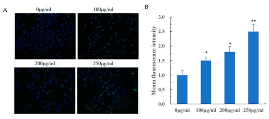 SNH induced the autophagy of MCF-7 cells. After cells were exposed to various dosages of SNH (0, 100, 200, and 250 μg/mL) for 48 h, they were subsequently stained with primary LC3 antibody and FITC labeled secondary antibody and counterstained by DAPI solution. Cells were observed using a fluorescence microscope. (A) Representative immunofluorescence staining images of LC3 in each group. (B) Analysis of LC3 mean fluorescence intensity of each group. This experiment was performed three times. * p < 0.05; ** p < 0.01 versus the control group.