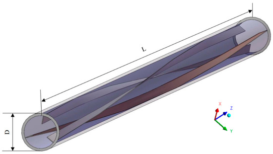 Because the formation of natural gas hydrate needs to pass through a series of complex physical and chemical processes, it does not exist directly in the pipeline. In this paper, only the flow of hydrate is studied in the numerical simulation process, and the formation of hydrate in the flow process is ignored, so it is assumed that hydrate particles have been formed at the entrance of the pipeline. In numerical simulation, the shape of hydrate particles is assumed to be a regular sphere with the same particle size, and the influence of the wall thickness of the pipeline system on hydrate formation is ignored in numerical simulation. The geometric model of diversion is shown in Figure 1. The horizontal pipe has a diameter of D = 0.032 m and a length of L = 2 m, and a twist tape is installed from the entrance. The numerical simulation calculation adopts the X-Y-Z three-dimensional rectangular coordinate system; the origin of the coordinate is set as the center of the entrance face of the pipeline, and the flow direction is set as the positive direction of the Z-axis, flowing from the left end to the right end of the pipeline.