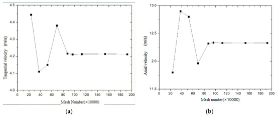 Grid independence verification. (a) Graph of tangential velocity changing with grid. (b) Diagram of axial velocity changing with grid.