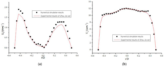 Comparison of numerical simulation and experimental results. (a) Comparison diagram of tangential velocity distribution along the diameter. (b) Comparison diagram of axial velocity distribution along the diameter.