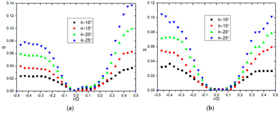 As shown in Figure 6, the influence of the placement angle of the twist tape on the radial variation of swirl number under the condition of Re = 20,000 is shown. It can be seen from the figure that the vertical radial swirl number is obviously higher on the side that passes through the twist tape than on the side that does not pass through the twist tape, while the values on both sides of the horizontal radial swirl number are balanced. In addition to this difference, the overall value of radial swirl number increases with the increase of installation angle; its maximum value appears near the pipe wall, and the swirl number at the pipe axis tends toward zero.