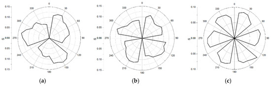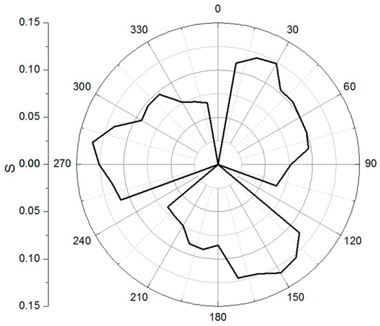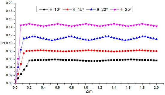 As shown in Figure 7, the influence of the placement angle of the twist tape on the variation of swirl number along the way under the condition of Re = 20,000 is shown. It can be clearly seen from the figure that the swirl number of the twist tape is not constant all the time but is divided into two parts, namely, the acceleration section and the stable section. The curve of the stationary part of rotation is sinusoidal, and the larger the angle of the twist tape, the larger the deviation and amplitude of the curve, and the faster the fluctuation frequency. As can be seen from Figure 6, the larger the setting angle of the twist tape is, the larger the radial distribution value of the swirl number is, so the offset and amplitude of its sine function curve are also larger. As the lead of the 10-degree twist tape (the distance that the twist tape rotates 360 degrees along the pipe wall) is 1.069 m/r, that of the 15-degree twist tape is 0.703 m/r; that of the 20-degree twist tape is 0.517 m/r, and that of the 25-degree twist tape is 0.404 m/r, as can be seen from Figure 7. Figure 8 shows the circumferential variation of the swirl number of a pipeline with a twist tape setting angle of 25 degrees at a radius of 0.4D under the working condition of Re = 20,000. It can be seen from the figure that the circumferential variation of the swirl number is periodic, and it is 120 degrees, rotationally symmetrical about the center of the circle. The swirl number is in the range from the windward side of the last twist tape to the leeward side of the next twist tape, and the swirl number first increases and then decreases. At the three positions of 30, 150, and 270 degrees (30 degrees from the windward side of the twist tape, respectively), it can be found that the number of swirling flows in the lower part of the pipeline is larger than that in the upper part. This is due to the conservation of energy, the mutual transformation of kinetic energy, and gravitational potential energy, and the number of swirling flow is converted by tangential velocity and axial velocity, so the number of swirling flow along the twist tape fluctuates sinusoidally.