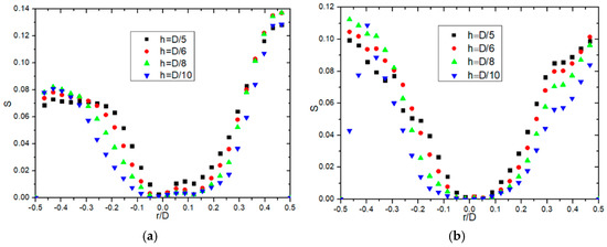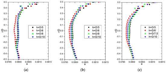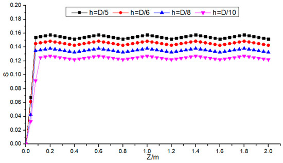 As shown in Figure 9, the influence of the height of the twist tape on the radial variation of the swirl number under the condition of Re = 20,000 is shown. The vertical radial swirl number on one side of the twist tape is obviously higher than that on the other side of the twist tape, while the values on both sides of the horizontal radial swirl number are balanced. In addition, the overall value of the radial swirl number increases with the height of the twist tape. The maximum value appears in the range of 0.4–0.45 D and does not vary greatly; the swirl number at the axis of the pipeline approaches zero. This shows that the change of the height of the twist tape has little influence on the maximum value of the radial swirl number and has a great influence only on the existing range of strong swirl (the swirl number is greater than the half value of the swirl number on the same side). The higher the height of the twist tape, the larger the range of strong swirl. That is, the higher the height of the twist tape is, the slower the radial swirl number decays, and the maximum swirl number is basically unchanged. Figure 10 shows the influence of the height of the twist tape on the swirl number along the way under the condition of Re = 20,000. It can be found that the higher the height of the twist tape, the greater the swirl number along the way. In this part of the study, the height of the twist tape is the only variable, and the setting angle of the twist tape is fixed, so the fluctuation frequency of the curve is the same. However, when the height of the twist tape is D/10, the length of the rotating acceleration section in the curve is longer than that of the other 3 twist tape pipelines. This is because the height of the twist tape is too short, and the twist tape cannot twist tape the main flow area at the axis well, so the twist tape effect is low. Therefore, when the height of the twist tape is D/10, the position of the initial swirl number in the curve is backward.