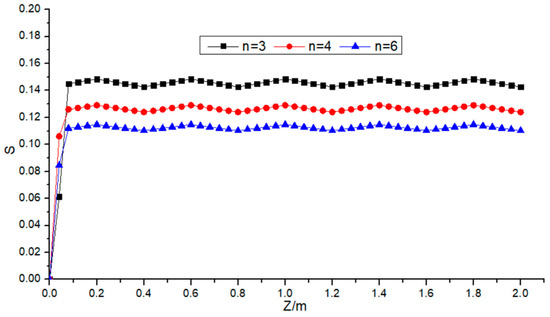 Under the working condition of Re = 20,000, the circular point at the 0.4 D circumference where the maximum swirl number appears is selected, and one point is selected every 10 degrees along the rotation direction. The point with 0 swirl number is the position of the twist tape. Since the height of the twist tape is greater than 0.1 D, the selected point is located inside the twist tape, so the swirl number is 0. The value results are shown in Figure 11. From Figure 11, it can be found that the change of swirl number in the pipe is not symmetrical around the X-axis or Y-axis but rotationally symmetrical around the center of the circle at 360/n, which shows a periodic change from the windward side of the twist tape to the leeward side of the next twist tape, which first increases and then decreases. The lower the number of twist tapes, the faster the number of swirling flows between the two plates decays. However, as shown in Figure 11, the number of swirls in the pipe with n = 6 is too large; the distance between 2 flow guides is too short, and the effective flow area on the cross section is too low, resulting in the overall swirl number in the pipe being too low. Figure 12 shows the influence of the number of twist tapes on the swirl number along the way under the condition of Re = 20,000. It can be seen from the figure that the more twist tapes, the lower the swirl number along the way. In addition, in the curve of the swirl number along the way of the pipes with four and six twist tapes, the acceleration section of the twist tape-off is obviously shorter than that of the pipes with three twist tapes. Because of the large number of twist tapes, the twist tape-off is faster.