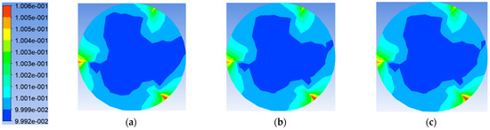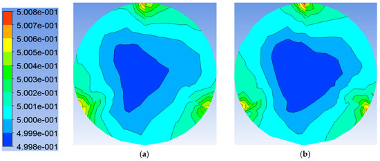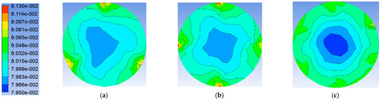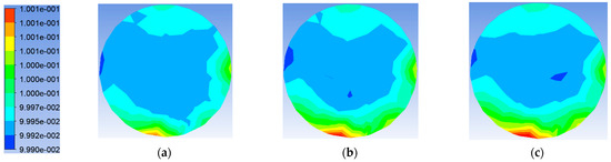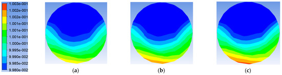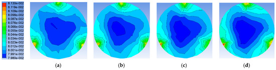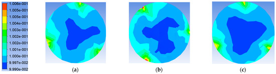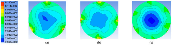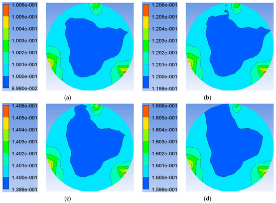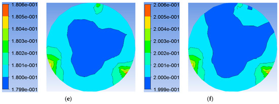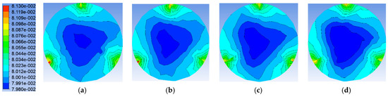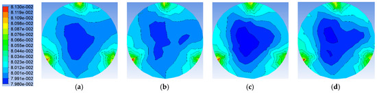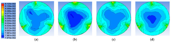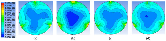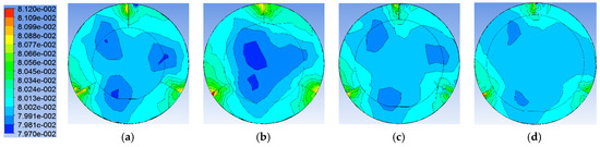 From Figure 16, it can be seen that the concentration at the bottom of the pipe is basically unchanged, there is no deposition phenomenon, and the concentration near the twist tape at the top of the pipe is the highest. From the numerical value of particle concentration, it can be seen that different placement angles have no obvious influence on the maximum concentration near the twist tape. This shows that the particles only flow together near the twist tape and do not accumulate and deposit or stick to the twist tape.