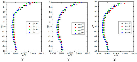 Figure 13, Figure 14 and Figure 15 show the relationship between the placement angle of the flow twist tape and the hydrate particle concentration in the pipe at the half-cycle or full-cycle cross section positions near the reference surfaces of Z = 10 D, 30 D, and 50 D under the working condition of Re = 20,000. It can be seen from Figure 13 that the high-concentration areas of particles are concentrated near three twist tapes, the concentration of particles on the leeward side of the twist tape is higher than that on the windward side, and the minimum concentration area at the axis position gradually becomes larger with the increase of the flow distance. It shows that the swirl has a good particle carrying effect, and the particles will not be deposited in the center of the tube bottom due to the influence of gravity. At the setting angle, the concentration of particles on the windward side of the twist tape in the pipe with = 25 degrees is higher than that in the other pipes with three different angles. At this time, the swirl flow is large, and the centrifugal force of the swirl flow on the particles is too large, so the particles are concentrated near the twist tape. However, due to the shear stress provided by the strong swirl flow, the hydrate particles will not deposit but will swirl forward close to the twist tape. Figure 16 shows the influence of the vertical tangent twist tape placement angle on the radial distribution of hydrate particle concentration at half-cycle or full-cycle positions near different reference surfaces under the working condition of Re = 20,000. The abscissa is the concentration, and the ordinate is the ratio of the distance between the detection point and the pipe axis and pipe diameter.