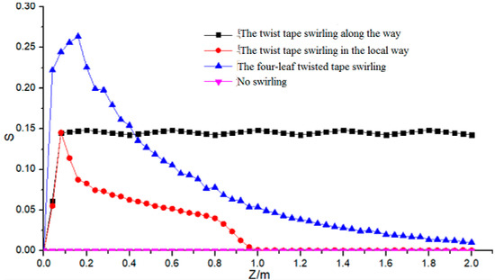 Figure 29 shows the influence of different whirling devices on the number of whirls along the way under the working condition of Re = 5000. It can be seen from the figure that the number of whirls along the way with local whirling will be attenuated when the fluid exits the end of the whirling device. The initial number of whirls of the twist tape with local whirling is larger than that of the twist tape, and the attenuation of the number of whirls is slower than that of the twist tape with local whirling, indicating that the local whirling efficiency of the twist tape is higher than that of the twist tape. However, when the twist tape rotates all the way, the swirl number curve of the twist tape fluctuates sinusoidally after reaching the initial swirl number, and the swirl number will not be attenuated. Therefore, when Z = 0.43 m, the number of the local swirl of the twist tape is equal to that of the twist tape. When the flow distance is greater than 0.43 m, the number of the local swirl of the twist tape is clearly larger than that of the twist tape. This shows that the efficiency of the whole-process twist tape of the twist tape in the pipeline with a total length of 2 m is about 4.65 times that of the local twist tape of the four-leaf twist tape. In the same way, the efficiency of the whole rotation of the twist tape is about 12.5 times that of the local rotation of the twist tape. Because the swirl flow will not appear in the horizontal smooth tube without the twist tape, the swirl number is zero in the whole tube section.