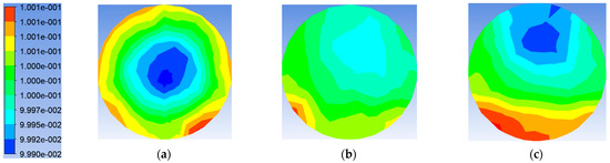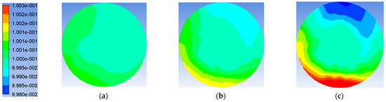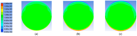Distribution diagram of particle concentration at different cross sections of the smooth pipe without twist tape. (a) Z = 10 D. (b) Z = 30 D. (c) Z = 50 D.