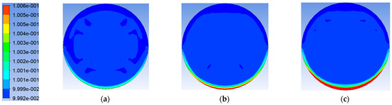 Sedimentary cloud diagram of time-varying particles in the smooth pipe without twist tape. (a) t = 0.2 s. (b) t = 0.4 s. (c) t = 0.8 s.