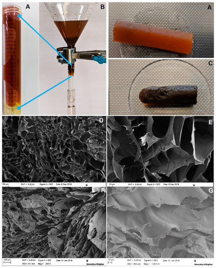 (A) Photo of CHI–GA cryogels before adsorption process; (B) experimental setup of the flowthrough AgNP filtration process; (C) CHI–GA cryogels after adsorption process. SEM images of the CHI–GA-1 cryogel prepared at −15 °C at different magnifications: (D) before filtration 200×; (E) before filtration 1000×, (F) after filtration 200×; (G) after filtration 1000×.