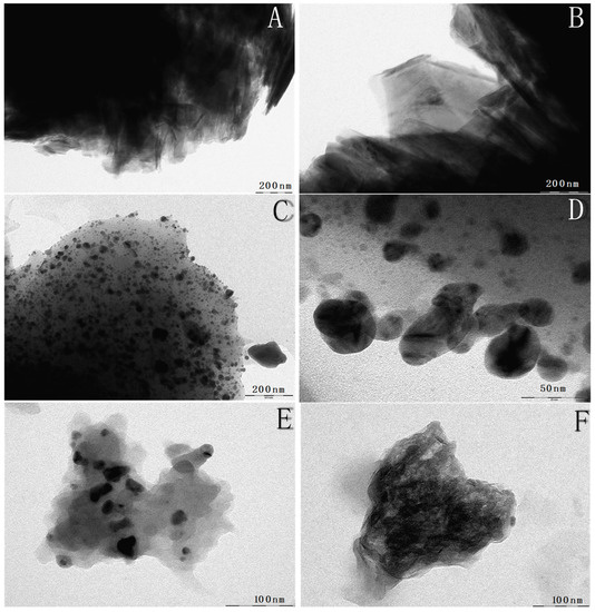 TEM images of the CHI–GA-1 cryogel: (A–F) after adsorption study at different magnifications.