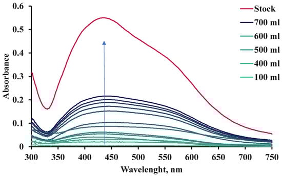 The AgNP suspension was diluted using a concentrated solution of nitric acid and incubated for several hours. The Ag+ ion solutions were determined using an atomic absorption spectrophotometer (AA-6200 instrument, Shimadzu, Kyoto, Japan). These data were then used for the establishment of a correlation between the metal ion concentration and AgNP concentration determined via measurements of optical density from the peak SPR, as well as measurements of the relative SPR surface area under the peak in the range of 350–750 nm. Note that not all compounds in the plant extract participate in AgNP stabilization; therefore, the simulated wastewater contained some other organic compounds along with the AgNP suspension. However, the UV spectrum of the plant extract did not reveal any compounds with absorption in the visible spectrum. This experiment confirms the absence of interference for AgNP concentration.