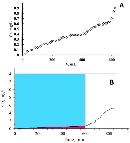 The adsorption capacity was calculated using the UV/Vis spectra absorbance from the peak SPR of AgNP and a calibration curve. The breakthrough curve represents the relationship between adsorbed (area above the curve) and effluent (area under the curve) species. The total mass of AgNPs in the fed solution until the breakthrough point is represented by a rectangle at points 0—breakthrough point (min) and 0—initial concentration (mg/L). Additionally, the ratio between the surface area under the breakthrough curve and the AgNP concentration was established (Figure S10).