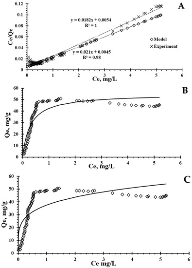 Numerical values of and can be found from the intercept and slope of the linear form of the plot [40]. The value of , maximum capacity at time t, was calculated by plugging the value of (equilibrium concentration) at time t into the equation.