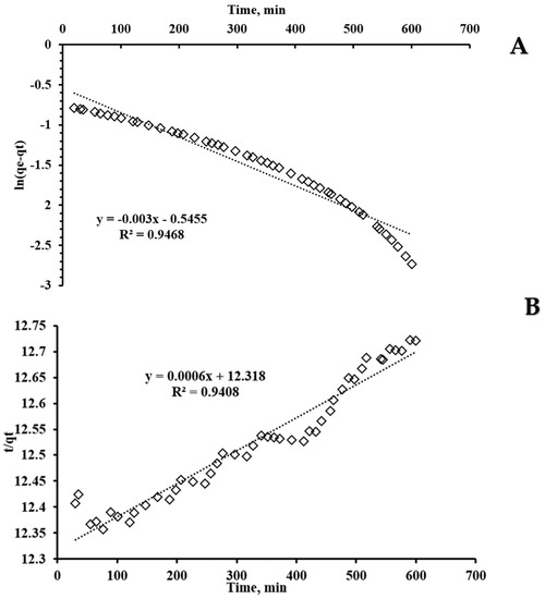 where and (mg·g−1) are the adsorption capacities at equilibrium and at time t, respectively, and (min−1) is the rate constant of pseudo-first-order adsorption.