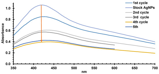 Change in UV/Vis of spectra of the filtrate containing AgNPs after passing through the CHI–GA-2 cryogel (2 g wet weight) at a flowrate of 10 ± 2 mL/ min. Concentration of AgNP stock suspension: 24 mg/L; first cycle—120 mL of AgNP suspension passed via cryogel; second cycle—120 mL of AgNP suspension after first cycle passed via cryogel; third cycle—120 mL of AgNP suspension after second cycle passed via cryogel; fourth cycle—120 mL of AgNP suspension after third cycle passed via cryogel; fifth cycle—120 mL of AgNP suspension after fourth cycle passed via cryogel. Arrow indicate UV-vis spectra of samples after filtration from 1st, 2nd, 3rd to the last sample.